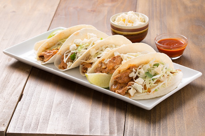 | 4. | Spoon chipotle chicken filling into centre of the taco shell and top with mexi-slaw, Queso Blanco cheese, and hot sauce. Fold the taco in half to enclose the filling. |